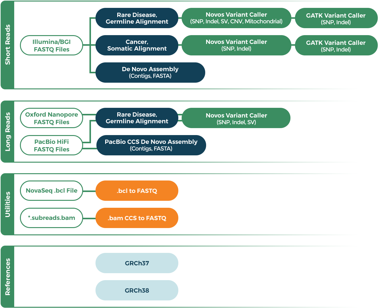 A single platform supporting major short-read NGS and long-read sequencer vendors. No need to onboard another secondary analysis tool when new sequencer types are introduced.